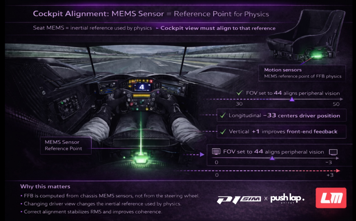 One often neglected point deserves real attention: Force Feedback isn’t the result of a physics calculation based on the chassis inertial frame. Changing the virtual driver position therefore shifts your perceptual reference relative to the calculation reference. And when you’re chasing coherence, that offset eventually shows up in signal stability.
