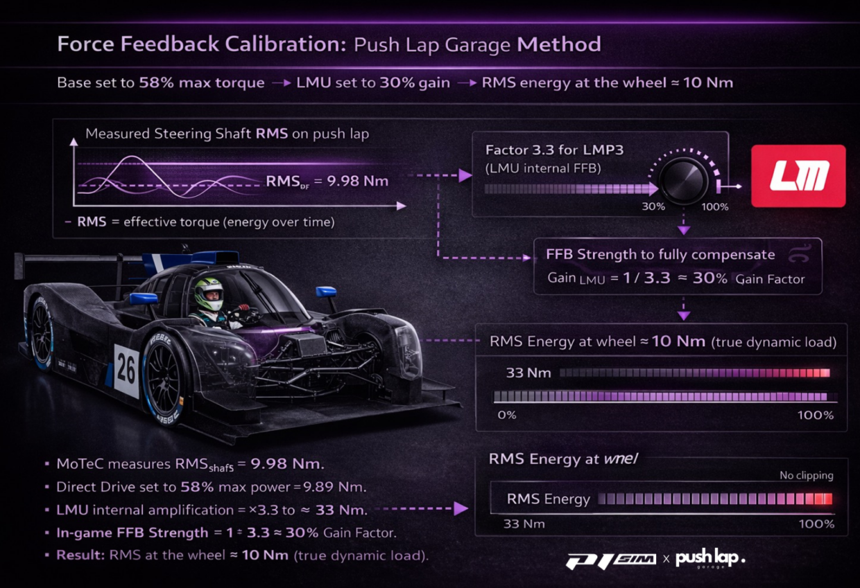 In Le Mans Ultimate, Force Feedback must be understood as a continuous energy system, not a collection of maximum forces. Steering torque is an oscillating signal, constantly changing sign and amplitude: in that context, the physically meaningful quantity for setting the FFB scale is not a peak, but the RMS (Root Mean Square) of steering torque—its effective amplitude over time.