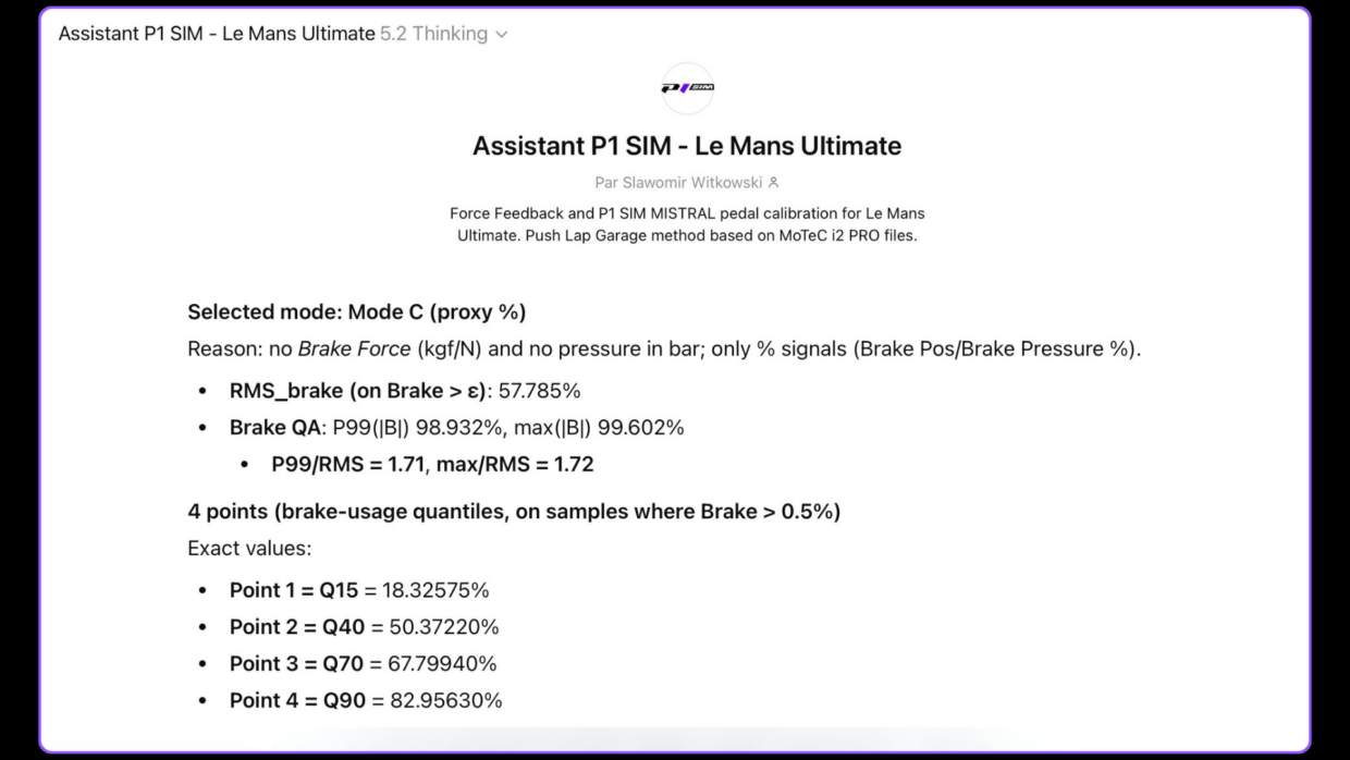 So the real question isn’t whether AI can help, but when it becomes relevant. As long as the link between the simulator’s physics, telemetry, and Direct Drive hardware isn’t locked down, any automation is pointless. With the Ligier JS P325, the building blocks are finally in place to cross that line: a usable MoTeC log, a clear protocol, and robust metrics.